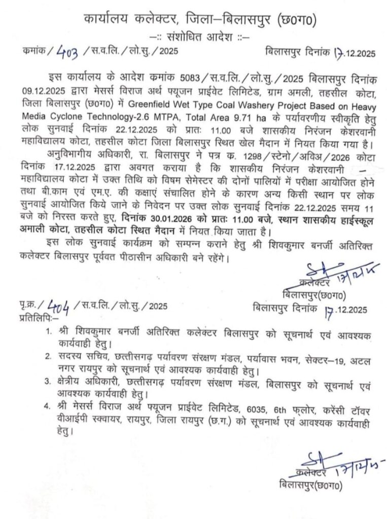 जिले के कोटा तहसील अंतर्गत ग्राम अमली में प्रस्तावित ग्रीनफील्ड वेट टाइप कोल वॉशरी परियोजना को लेकर आयोजित की जाने वाली जनसुनवाई को प्रशासनिक कारणों से स्थगित कर दिया गया है। यह आदेश कलेक्टर बिलासपुर द्वारा जारी संशोधित आदेश के तहत दिया गया है।