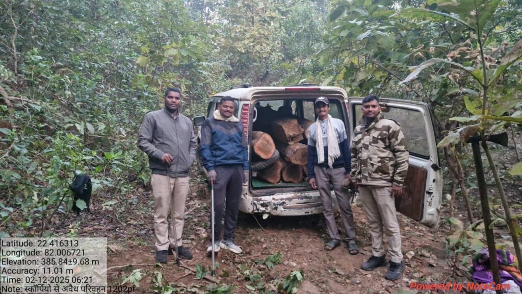जानकारी के अनुसार, रात्रि में मुखबिर से सूचना मिली कि करही–कछार मार्ग से एक वाहन में सागौन प्रजाति के इमारती लट्ठे अवैध रूप से लोड कर ले जाए जा रहे हैं। सूचना पर परिक्षेत्र सहायक के नेतृत्व में टीम तत्काल मौके पर पहुंची। संदिग्ध वाहन कक्ष क्रमांक 1202 PF, वनदेवी मंदिर करही–कछार मुख्य मार्ग से तेजी से बेलगहना की ओर भागने लगा। टीम ने लगातार पीछा किया, लेकिन चालक करही कछार फाटकपारा, डोंगरीपारा से होते हुए जूना पानी पहाड़ी क्षेत्र में वाहन छोड़कर जंगल की ओर भाग निकला। वाहन की जांच करने पर उसमें 6 नग सागौन लट्ठा एवं 1 नग सागौन सिलपट अवैध रूप से कटाई कर लोड पाया गया।