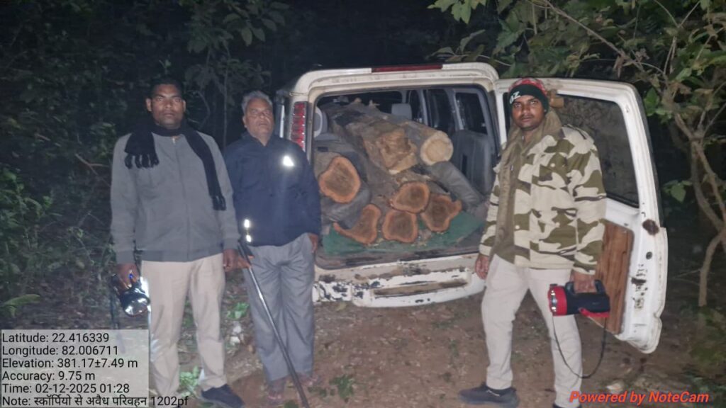 बिलासपुर —- बेलगहना वन परिक्षेत्र में मंगलवार देर रात (2 दिसंबर 2025) वन विभाग की टीम ने अवैध सागौन परिवहन के खिलाफ बड़ी कार्रवाई करते हुए एक स्कॉर्पियो वाहन (CG 19 C 6590) को सागौन लकड़ी के साथ जप्त किया है। वाहन चालक और मालिक मौके से फरार हो गए।