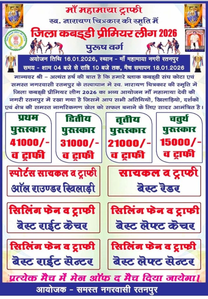 रतनपुर। माँ महामाया नगरी रतनपुर में स्व. नारायण चित्रकार की स्मृति में जिला कबड्डी प्रीमियर लीग 2026 (पुरुष वर्ग) का भव्य आयोजन किया जा रहा है। यह रोमांचक प्रतियोगिता 16 जनवरी 2026 से 18 जनवरी 2026 तक आयोजित होगी। प्रतियोगिता का शुभारंभ 16 जनवरी को शाम 4 बजे होगा, जबकि मुकाबले रात्रि 10 बजे तक खेले जाएंगे।