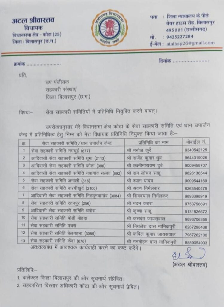 रतनपुर। कोटा विधानसभा क्षेत्र के विधायक अटल श्रीवास्तव ने सोमवार शाम अपने विधानसभा क्षेत्र अंतर्गत सेवा सहकारी समितियों के लिए विधायक प्रतिनिधियों की नियुक्ति सूची जारी की। जारी सूची में रतनपुर सेवा सहकारी समिति (क्रमांक 256) के लिए रतनपुर के वरिष्ठ कांग्रेस नेता मदन कहरा को विधायक प्रतिनिधि नियुक्त किया गया है।
