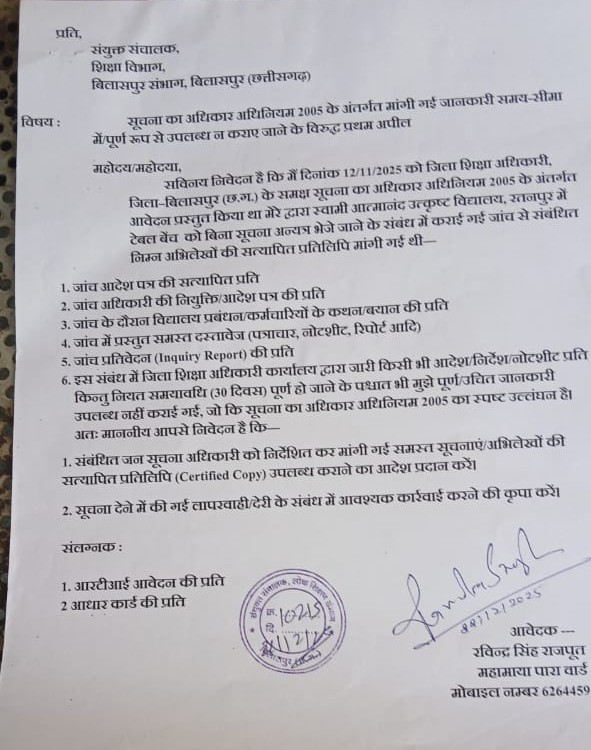 RTI में लापरवाही का आरोप,बिलासपुर जिला शिक्षा अधिकारी पर सवाल ,समय-सीमा के बाद भी नहीं दी गई जांच से जुड़ी जानकारी